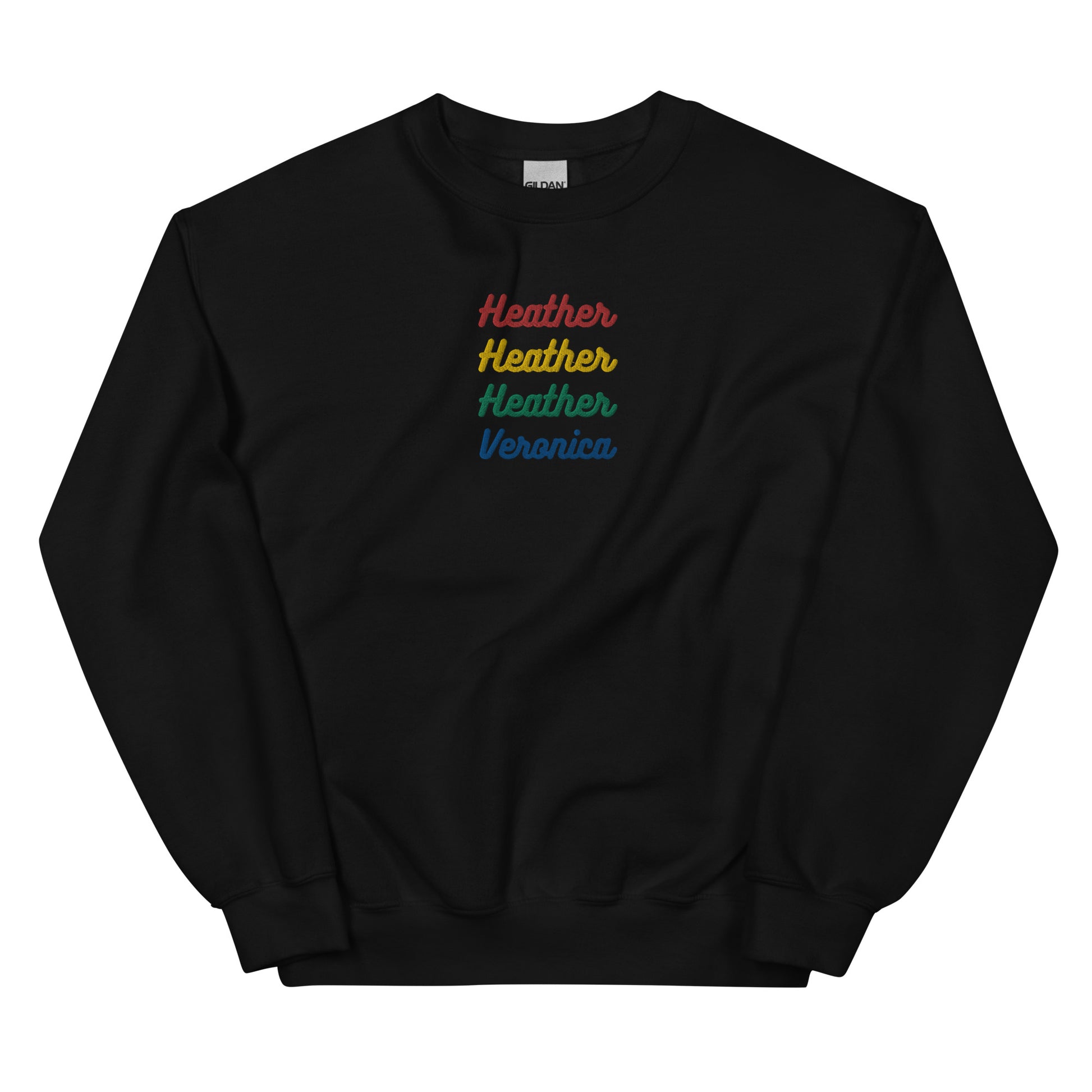 Channel your inner Heather (or Veronica) with this embroidered sweatshirt inspired by the iconic characters from Heathers the Musical! Whether you vibe with the red, green, yellow, or blue queen, this sweatshirt showcases each character in their signature color, making it a must-have for any die-hard fan of the darkly hilarious and totally iconic show.